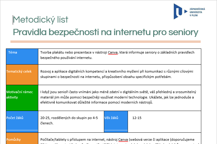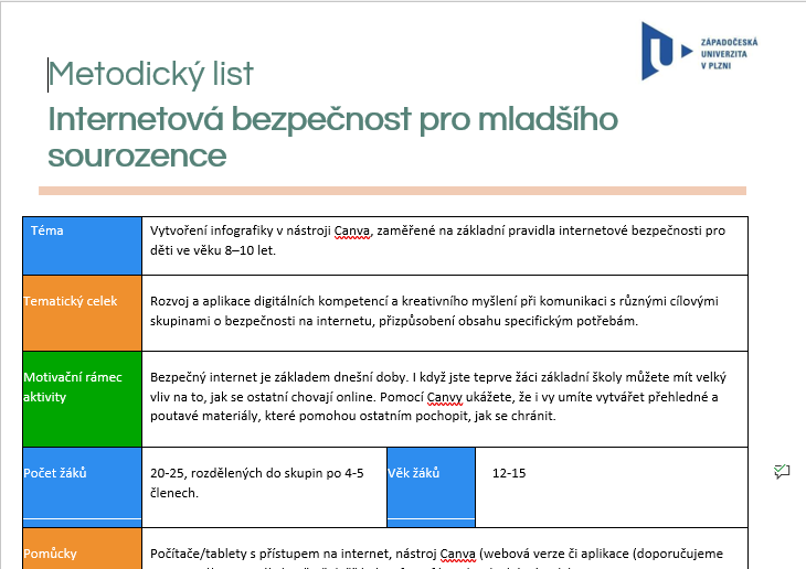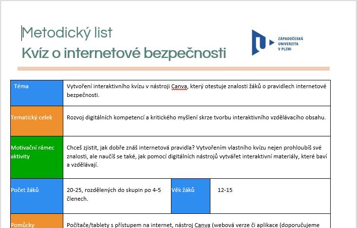 V každém z projektů pracují žáci ve skupinách, společně vyhledávají informace, plánují obsah i vzhled svého výstupu a využívají k tomu online nástroj Canva. Během hodin tvoří například infografiku, plakát nebo interaktivní kvíz na téma internetové bezpečnosti a digitálních pravidel. Nechybí ani prostor pro kreativitu, rozdělení rolí a závěrečnou prezentaci před třídou s reflexí.